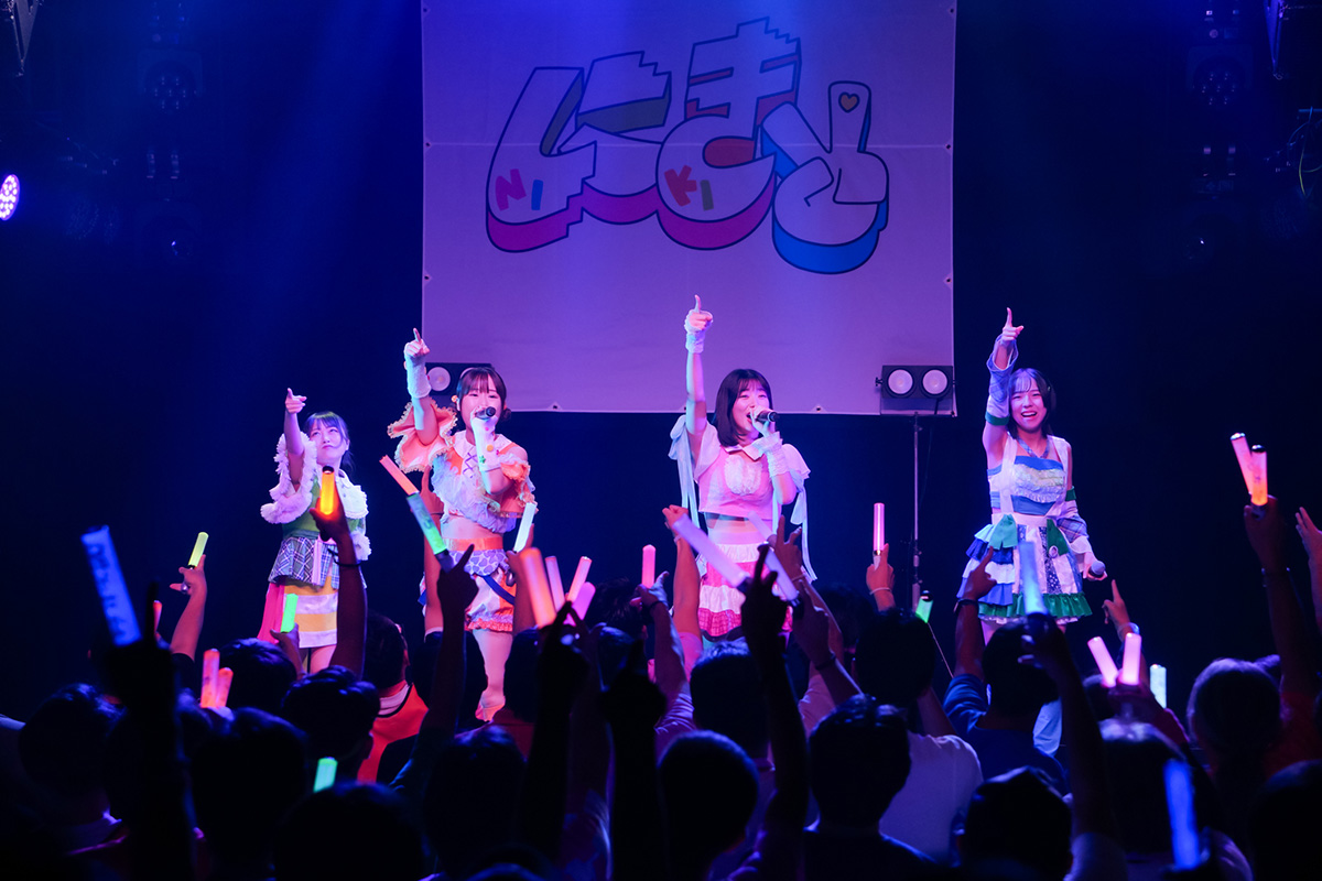 大勢のファンが詰めかけた会場にオープニングSEが流れ、にきちゃんがステージに登場。灼熱の夏を思い返すように、彼女たちは夏曲「ナツメグ」でライブをスタートする。普段はライブ後半に披露することの多いダイナミックなナンバーをライブ冒頭に持ってきたところからも、この公演にかけるメンバー4人の熱い気合が伝ってくる。続けて彼女たちは和メロブチアゲチューン「Dong-Dong-Dong!!!!!!!!」をたたみ込み、にきふぁみ(にきちゃんのファン)は強烈な盛り上がりを見せた。