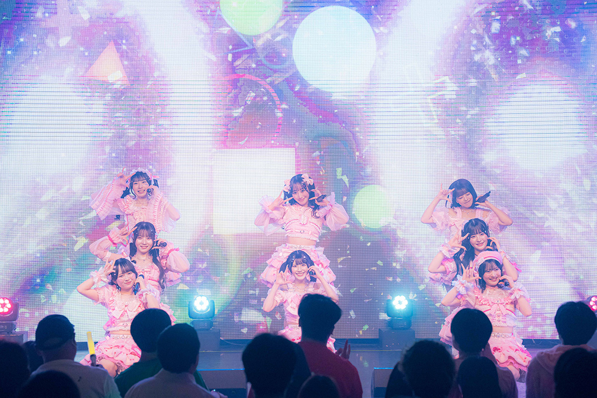 次に披露した『わたしを可愛くする魔法』は撮影可能曲。SNS上にもアップになっているので、ぜひチェックしてほしい。「女の子のリアルをお届けしましょう」のセリフから始まる『わたしを可愛くする魔法』は、彼女たちが歌声のメイクブラシを使って自分たちをどんどんかわいく彩っていくような、わちゃわちゃとした楽曲。歌詞に綴られた、女の子たちが胸の内に抱いている想いを8人が愛らしく届ける。彼女たちが、自分をかわいくさせる歌の魔法をみずからにかけてゆく姿に触れ、一緒に胸をドキドキさせていた。