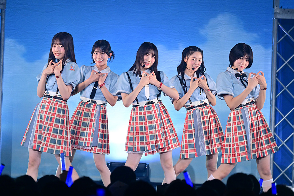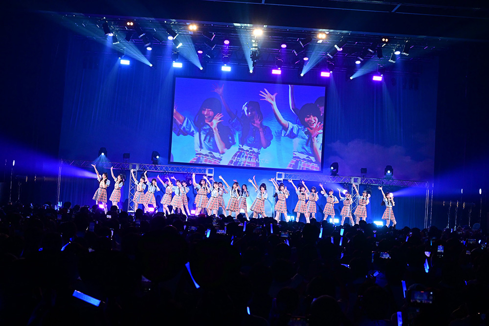 終盤には、2017年に坂道AKBが発表した楽曲「誰のことを一番 愛してる?」のカバーもパフォーマンス。愛と葛藤を描いたアンビバレントな世界観を、オリジナルをリスペクトし研究を重ねたダンスと鋭い表情で表現した。空気が一変する緊張感のあるステージに、客席からは思わぬサプライズに対する大きなどよめきと歓声が沸き起こった。「青空ディスコティック」「空色の水しぶき」で再びフロアを揺らし、本編は幕を閉じた。
