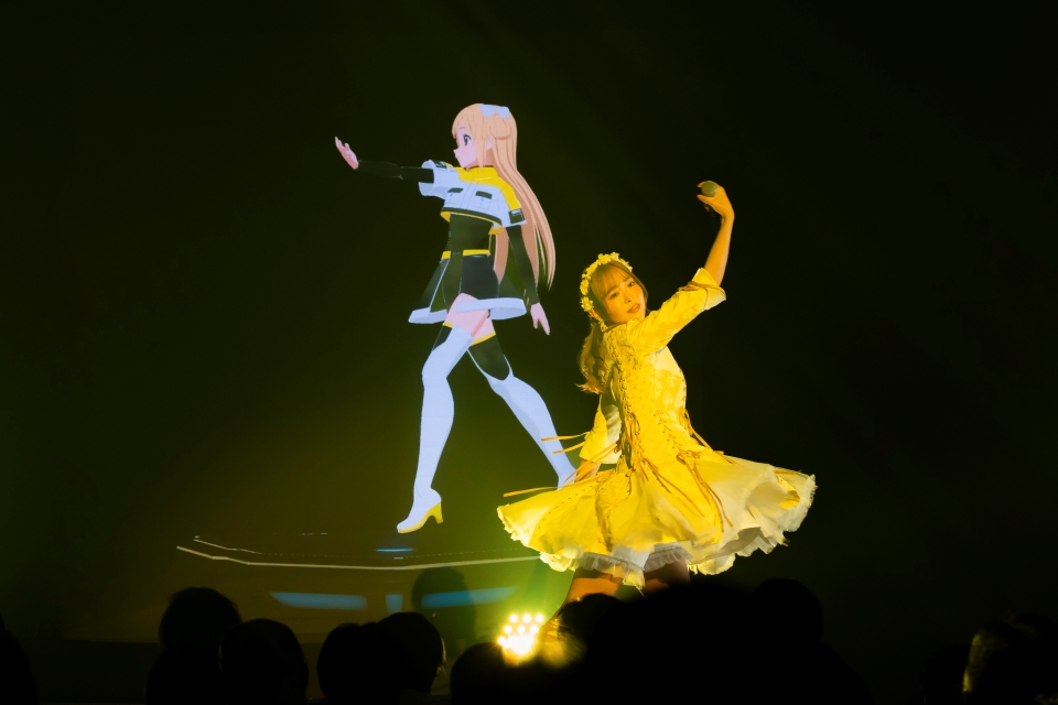MC後に会場が暗転し、ステージ上に相川奈央が演じる、西浦そらのキャラクターが突如現れると、場内からは大歓声があがった。「22/7 Star Travelers」の宇宙服衣装に身を包み、浮遊するかのように動く小さなドローンステージに乗って登場したキャラクターは、その後、リアルメンバーと夢のコラボパフォーマンスを魅せてくれることに。