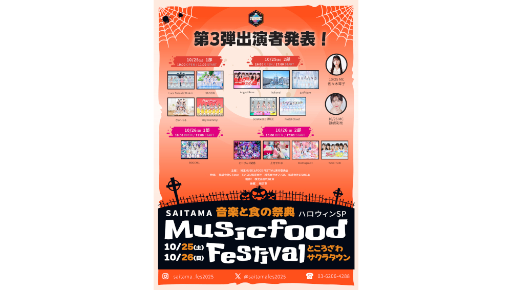 人気アーティストが埼玉に集結! 所沢市後援!歌と食を楽しもう!第三弾豪華出演者解禁【音楽と食の祭典】埼玉 MUSIC&FOOD FESTIVAL ハロウィン SP 2025年10月25日(土)・10月26日(日)ところざわサクラタウン