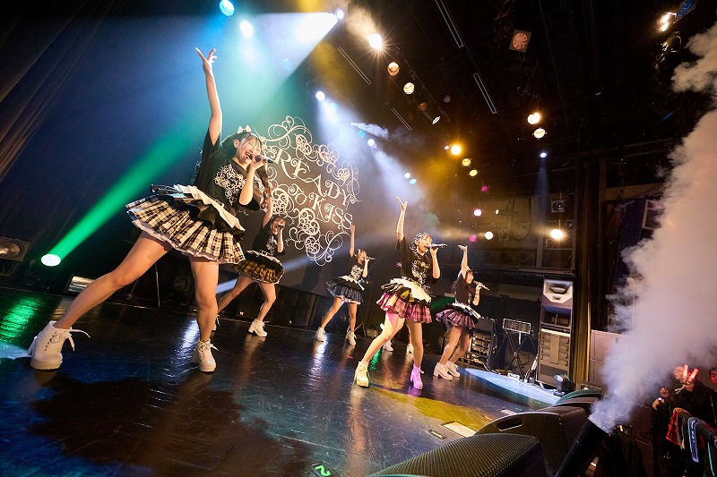 お馴染みのメンバーコールを組み入れたSEが流れだすや、フロア中から熱い声が張り上がる。ライブは、グループ名を冠した曲であり、READY TO KISSがメジャー最初のシングルとして発売した『READY TO KISS』からスタート。今宵の彼女たちは、とてもかわいいレディメイド姿。年齢はさておき、いつまでも恋に恋する乙女心を歌う彼女たちにとても似合う装いだ。メンバーらが愛らしい声で「君に キスしてもいいですか」とせまるたびに胸がキュンと鳴るのもお約束。いつの時代でも、どんな編成だろうと、いつだって彼女たちはハートをときめかせる魔法をかけていく。そこに、READY TO KISSの魅力を覚えずにいれない。