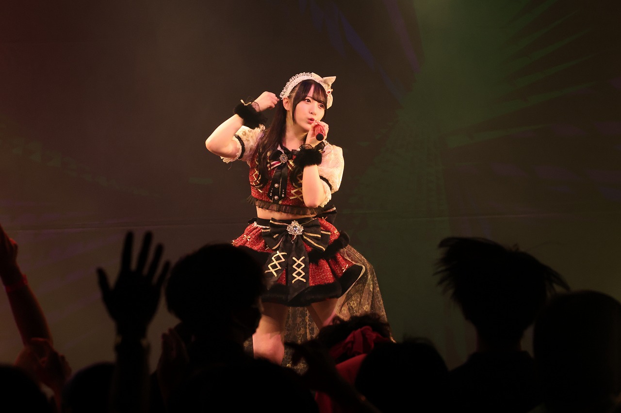そんな最強の関係をさらに華やかに、でも熱く燃え立てるように、上月せれなは『最強メロディー4』を愛らしく歌いだした。メロくてポップでキャッチーな楽曲に刺激を受けた観客たちが、彼女と一緒に「うりゃおい!!」と声を交わしあう。間奏では、上月せれながステージを左右に走りながら、フロアにWAVEする景色も作りあげていた。