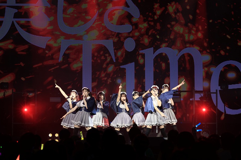 晴れた爽やかさへ純情と情熱を降り注ぐように、彼女たちは『ユメノカタチ』を元気いっぱいに歌っていた。この曲では、一人一人が歌をリレー。それぞれの声の魅力を味わえたのも嬉しい。間奏では、渚カオリが「私たちにはもっと叶えたい夢がある。その夢を何時かつかむまで絶対に私たちの手を離さないで」と、センパイ方へ向けて叫んでいた。夢をつかむまで走り続ける、その強い決意を、7人はこの曲に乗せて力いっぱい伝えていた。最後に飛び出した「センパイ、大好きだよ」の言葉も嬉しいエールとして胸に届いていた。