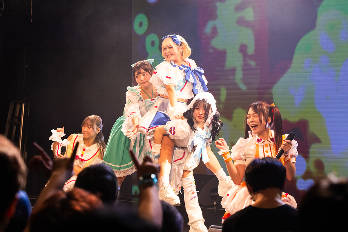 ライブでお馴染みの『ナカザワールドカオス』が飛びだしたとたん、場内のあちこちから、彼女らに向けて熱いかけ声が張り上がる。風を切って駆けるスリリングなのに情熱的な楽曲に乗せ、小ばぁびゐが自転車になって愛妹みいを乗せて走る場面も登場。5人のポジティブでハイテンションなパワーが、この会場を熱狂したカオスな空間に染め上げていった。