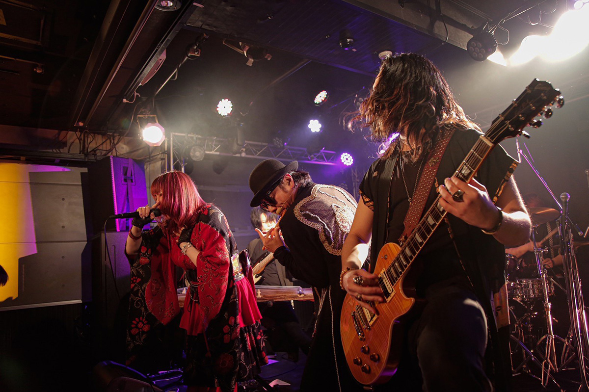 先に披露したのが、「Chronicle」。戦慄にも似た、何かが起きそうな予感を覚える荘厳でシンフォニックな音色が流れだす。「Chronicle=年代記」という言葉に相応しい、壮大なドラマを描きだすスリリングな楽曲だ。永遠の命を手にしたヴァンパイアの命途絶えないからこそ嘆く感情など、悲劇とも言える物語を、MIKIKOは語り部となって歌い唱えてゆく。ゴシックでシンフォニックな音の上で、TAKAの篠笛が泣き叫ぶように狂気した音色を響かせる。Tommyの奏でる箏の音は、ときに乱れ狂う感情へ攻撃的に寄り添えば、ときに嘆く心を凛とした音で包み込んでいった。物語の展開に合わせ、楽曲も、MIKIKOの歌声も様々な表情を見せてゆく。この「Chronicle」、壮大な序章から幕開けたとたん、一気に物語を走らせ、長大なクライマックスシーンへと繋がるような、激情したドラマを描きだす楽曲だ。AKARAのメンバーたちは、哀しいヴァンパイアの恋物語を歌い奏でながらも、その中へ、ここへ至るまでの様々な苦難と逆境を乗り越えた不屈の闘志を重ね合わせていた。MIKIKOも、Tommyも、TAKAも、現状を壊し、ここから新たな物語を描き出そうという強い意思を、この曲に思いきりぶつけていた。