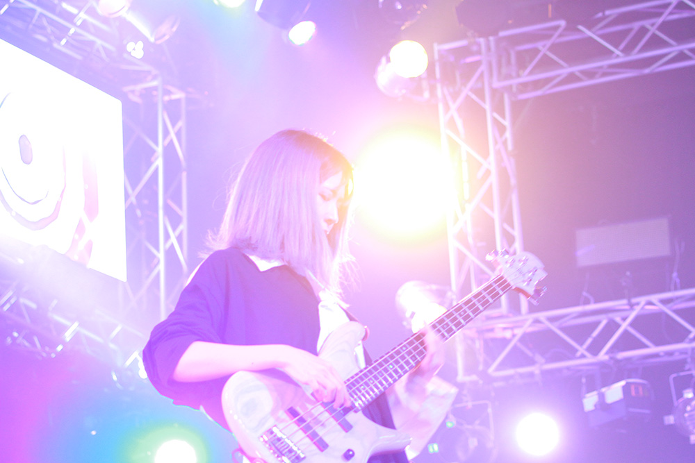 この日がデビューライブになった、月照ラス。たおやかな音色に乗せ、メンバーらが舞台へ。デジタルな音色が流れだすのを合図に、ヴォーカル/ギターを担うemのいくつも重ね合わせた歌声が力強くも壮麗なハーモニーを作り上げ、その声を場内中に響き渡らせた。ビートが高鳴るのに合わせ、楽曲が、そしてemの歌声も高揚していく。次第に熱を上げる歌声と演奏。サビではemは荒いデジタル系のギターロックナンバーに乗せ、高ぶる感情を力強く解き放つように歌っていた。『Moonshot』、クールさとエモい魅力を巧みにミックスアップした楽曲だ。emの揺れ動く感情とシンクロするように、楽曲も表情を豊かにしてゆく。emの心の声が、音楽へダイレクトに反映。クールなのに生々しさを覚えるのも、それが理由か…。