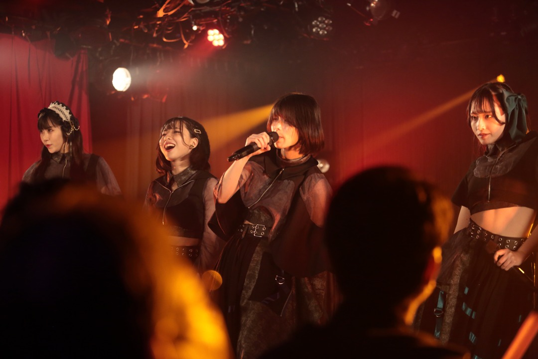 その勢いへ、さらに黒い衝撃を塗り重ねるように、彼女たちは『Hell Hell Hell』を歌唱。凛々しい表情が、さらに凛々しさ増してゆく。突き刺すようにという言葉がお似合いだろうか。メンバーたちは、オラオラとした声でがなるように歌い、煽りながら、フロア中の人たちの理性をガツガツと奪い去ってゆく。舞台の上から熱く挑発し続けるメンバーたち。その挑発に惹かれるように、たくさんの人たちが高く掲げた拳やペンライトを力強く振りながら、熱狂の渦の中へと落ちていった。