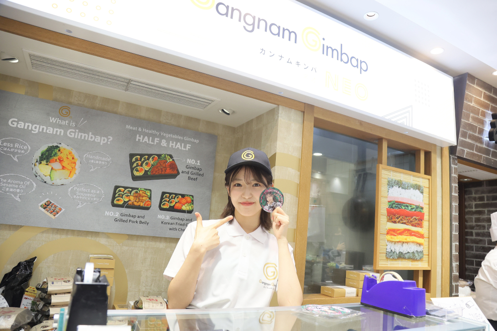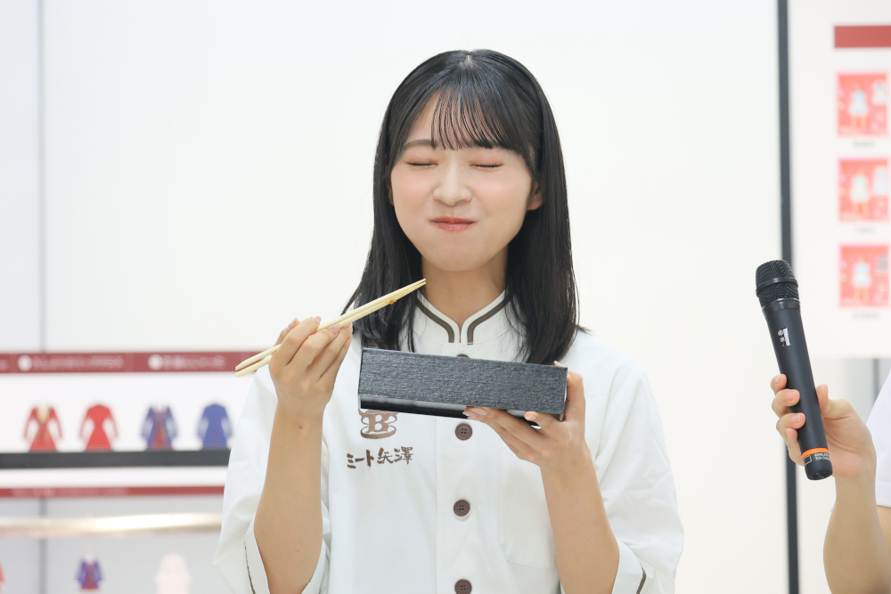 10 月 23 日(木)、B1F のお弁当・お惣菜売り場で代表メンバー6 名が実際に店舗に立ち、コラボ商品の販売をお手伝いをした。山内瑞葵は「ミート矢澤」、下尾みうは「カンナムキンパ NEO」、花田藍衣は「つきじ鈴富」、⻑友彩海は「牛タンかねざき」、橋本陽菜は「洋食や 三代目たいめいけん」、永野芹佳は「パパブブレ」とコラボしており、それぞれの店舗のユニフォームを身に纏って登場。事前抽選で当たった方や当日商品を購入されたお客様にとびっきりの笑顔で商品をお渡しし、各店舗とも大きな賑わいを見せた。