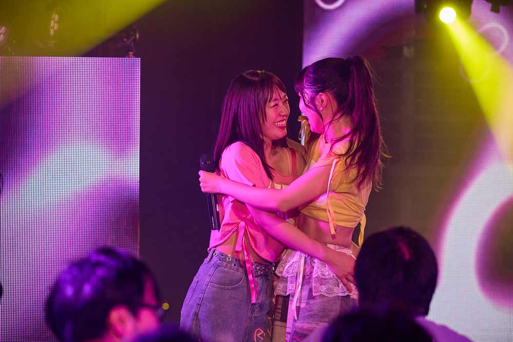 灼熱のライブも残り1曲となり、MCタイムでメンバーがライブの感想を語っていく。小野田は「私とちとせちゃんは、9月7日のお披露目のときに初めてみなさんの前に立たせていただいたんですけど、そのときは「FOREVER YOUNG」をユニゾンだけの形の参加させてもらいました。でも、今回は全部の曲でフルで参加させてもらったんです。今日ライブをして、私は、みなさんが私たちのためだけに時間を使ってここに会いに来てくださったことがほんとにうれしくて。すっごい楽しいし、こうしてライブできるのってすごくいいなって、今やりながらずっと思ってました。みなさん来てくれてありがとうございます!」、松永は「レッスンではずっと鏡の前で練習したんですけど、こうしてみなさんの前でたくさんの楽曲を披露できたことが素直にうれしいし、ファンのみなさんがいなきゃ私たちは成立しないんだなってことも思いました。みなさんの支えがあれば、私たちは宇宙に行けそうです!」と、アプガ(仮)のメンバーとしてステージに立てた喜びを口にする。