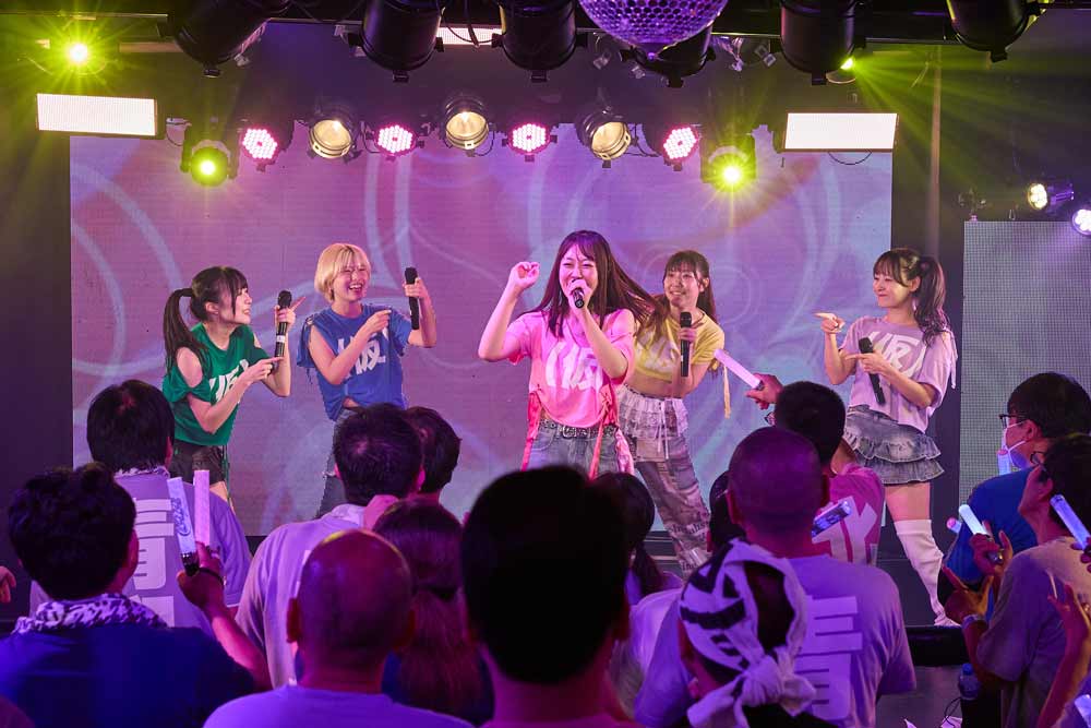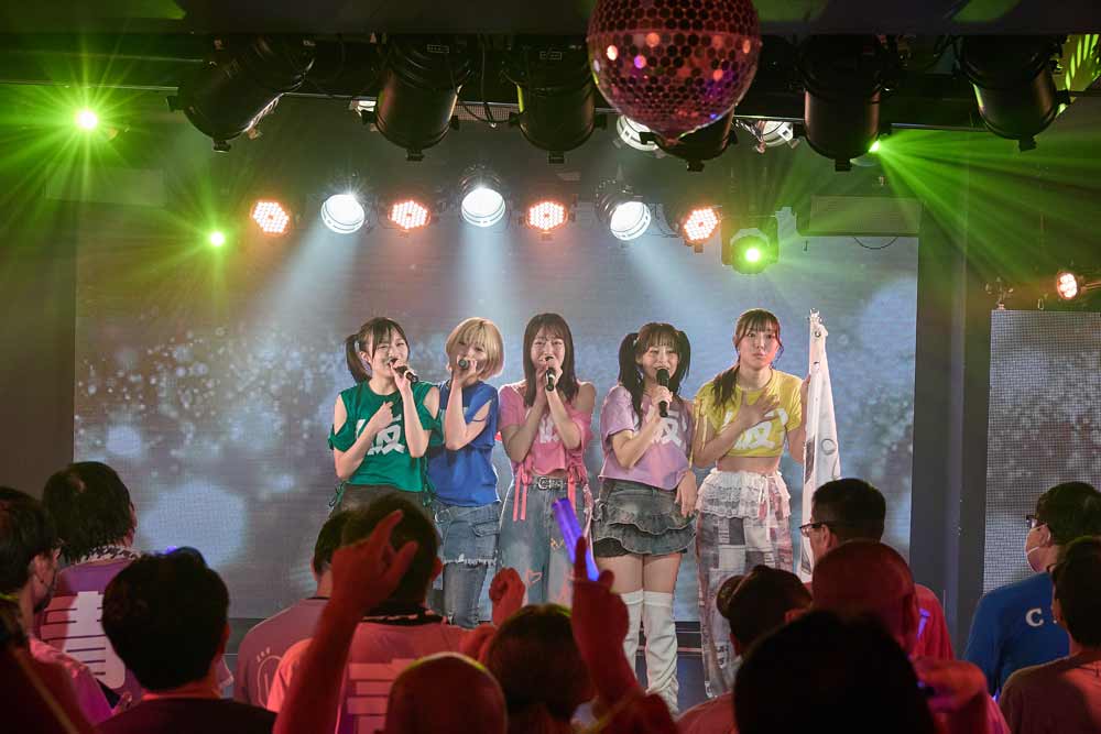 すでに会場は灼熱の夏を思い出させるようなアツアツ状態。しかし、アプガ(仮)は攻めの姿勢を崩す気など毛頭ない。ここから7曲連続披露の怒涛のヒートアップゾーンに突入する。キラーチューン「アッパーカット!」をお見舞いすると、盛り上がり必至の「アッパーレー」「チョッパー☆チョッパー」をブチかまし、「愛愛ファイヤー!!」を情熱感たっぷりにパフォーマンス。「キラキラミライ」で明るい希望感を届け、「お願い魅惑のターゲット」でフロアを大爆発させる。そしてエモーショナルな「アルストロメリア」を披露し、メンバー5人は突き抜けるような世界観を作り上げた。