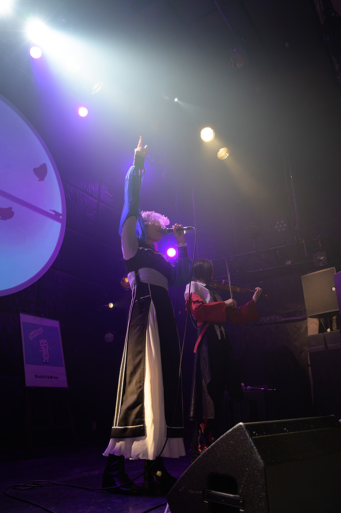 つむぎしゃち(ボーカル/ストーリーテラー)と舞氏(バイオリン)が袖から登場し、フロアの拍手が息の合ったクラップに変わると、つむぎが〈とまれとまれ指とまれ〉と歌い出す。初ワンマンの 1 曲目にこの上なくふさわしい、キミのねデビュー曲「あいまいハロー」だ。青の衣装で指を高く掲げるつむぎと、赤の衣装で踊るようにバイオリンを奏でる舞氏に、熱を帯びた掛け声が飛ぶ。続いて照明が赤に変わり、シームレスに始まったのは「ハルカナアルカナ」。間奏では舞氏が華麗なソロを披露し、フロアからは高揚感たっぷりの歓声が沸いた。