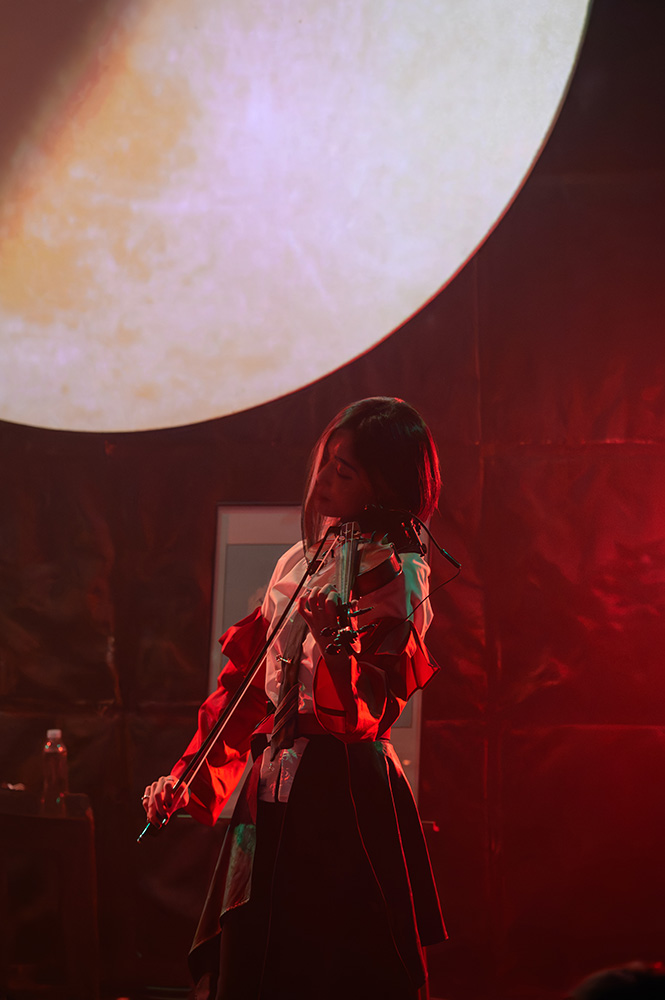 ここからは怒涛のアッパーソング。「怪盗ダンサー」では、つむぎが生み出す架空の物語『怪盗-アイ-』の主人公・アイが三日月に座るシルエットをバックに、ダーク&キュートな世界観でフロアを魅了する。続く「ウォン・テッド」も『怪盗-アイ-』の架空タイアップ曲。オーディエンスはタオルを勢いよく振りまわし、サビ前の〈それなーんだ!〉のコールも今日イチの声量。その熱量に呼応するように、舞氏も弓をブンブンと振りまわす。