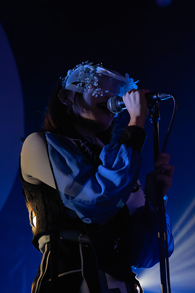 「3 人でしかできない特別なことを用意しました」。つむぎのその言葉から始まったのは、アコースティックバージョン初披露となる「あいくらふと」。TV アニメ『アラフォー男の異世界通販』エンディングテーマであり、海外リスナーからの反響も大きかった曲だ。3 人の音だけで紡がれる愛の歌に、控えめなステージライトがそっと寄り添う。つむぎのヘッドドレスが光を受けてキラキラと輝く様は、この温かいラブソングをさらに純度高く美しいものにしていた。