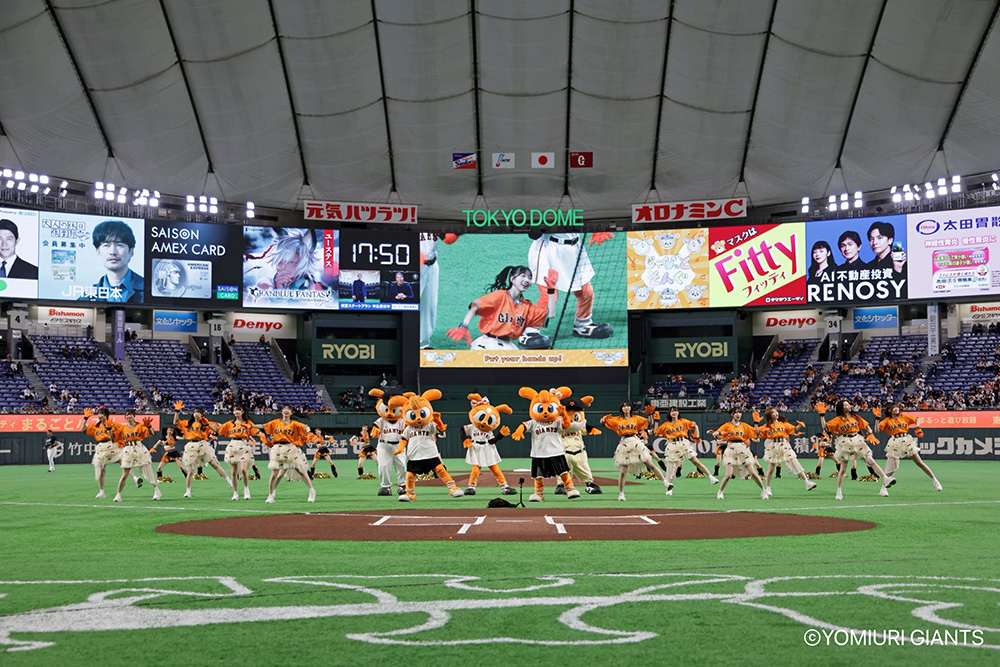 3月18日(水) のオープン戦の試合開始前パフォーマンスタイムに、読売ジャイアンツのユニフォームを着用した≒JOYメンバーが登場。
