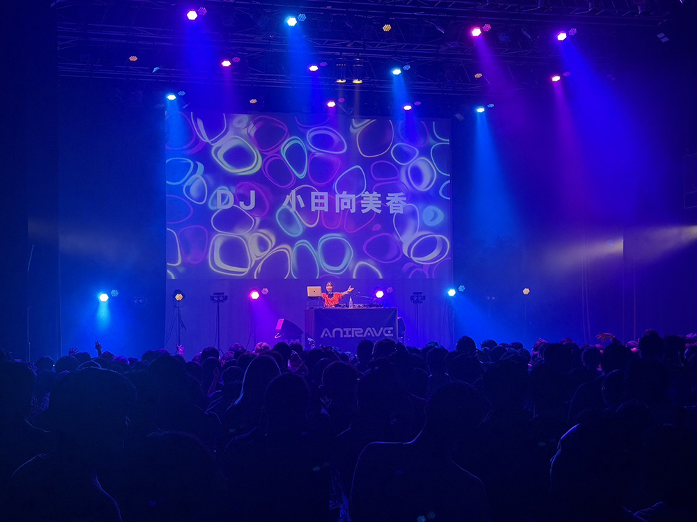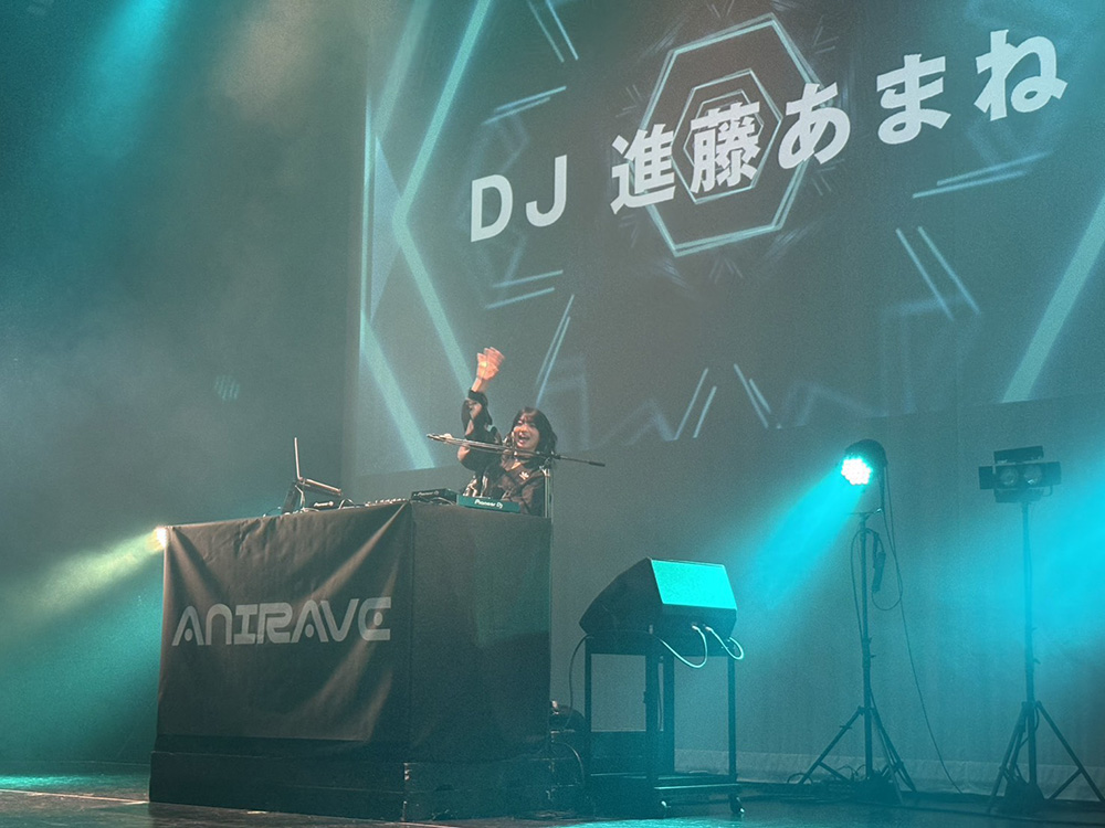 続いて、声優やアーティストとしてもマルチに活動するDJ 小日向美香が登場。この日は記念すべきDJデビュー戦。自身の楽曲『ひなたぼっこ。』を皮切りに、MyGO!!!!!の『迷路日々』や『歩拾道』などエモーショナルなナンバーを時折クラップを強く煽るなど、初舞台とは思えない堂々とした姿でフロアをリードしていく。「次の曲はみんなで踊れる曲を持ってきましたー!」と弾ける笑顔で叫び、fhánaの『青空のラプソディ』を投下すると、会場は一気にお祭り騒ぎに。Aqoursの『恋になりたいAQUARIUM』や大橋彩香の『NOISY LOVE POWER☆』では、フロアからも凄まじいコールとジャンプが巻き起こり、小日向を全力でバックアップ。「私の大好きな曲をかけていきますよ!」と宣言した中盤戦では、北白川たまこの『ドラマチックマーケットライド』から、『DREAM SOLISTER』『ハレ晴レユカイ』『Cagayake!GIRLS』とキラーチューンを連発。終盤にはChouChoの『優しさの理由』、茅原実里の『境界の彼方』、涼宮ハルヒの『God knows…』など、全18曲を一気に畳みかけた。