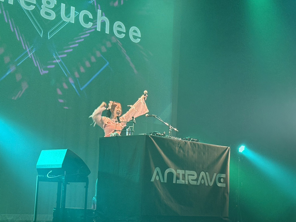 続いて登場したのは、アニレヴにとって欠かせない存在となっているDJ Meguchee(櫻川めぐ)。「皆さん、盛り上がっていきましょう!」と冒頭から全力で煽ると、DANCEROIDの『メグメグ☆ファイアーエンドレスナイト』を投下。フロアは一斉にオレンジ色のペンライトを激しく振り回し空気が作り上げられていく。さらに「バンドリ!10周年、盛り上がっていきましょう!」と叫び、Poppin'Partyの『Yes! BanG_Dream!』からRoseliaの『R』など、自身ゆかりの楽曲を立て続けに披露。MCでは、「アニレヴが、ついにこのCLUB CITTA'まで来ました!」と感慨深げに語りつつ、「まだまだ盛り上がれるセトリを持ってきたので、明日のことなんて考えずに楽しみなさい! みんなのニューライフを応援すべく、盛り上がる曲を流していきたいと思います」と愛のあるメッセージで観客を鼓舞。続けて、μ'sの『僕らのLIVE 君とのLIFE』を皮切りに、水樹奈々の『DISCOTHEQUE』、L'Arc〜en〜Cielの『READY STEADY GO』と、キラーチューンを畳み掛けるようにスピン。フロアからは地鳴りのようなコールが沸き起こり、会場の熱気はさらに一段階引き上げられた。いよいよラスト3曲と告げると、客席からは「えー!」と惜しむ声が漏れたが、最後はRoseliaの『BLACK SHOUT』、『PASSIONATE ANTHEM』、『FIRE BIRD」を連続で投下。会場中のボルテージを最高潮まで高めきったまま、次なるアーティストへと完璧なバトンを繋いだ。