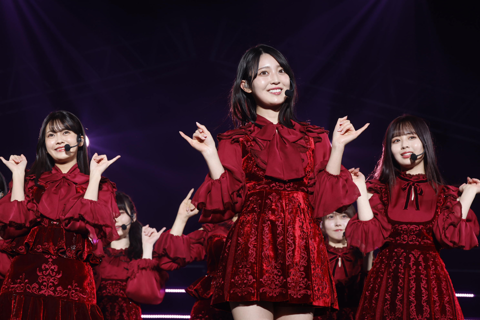 「Overture」に続いてステージにスポットライトが当たると、真紅の衣装を身に纏ったメンバーが横一列に並ぶ姿が浮かび上がる。すると、本公演の座長を務める中西アルノが「アンダーライブ最終日、全員いくぞーっ!」と力強く叫び、そのままライブは「マシンガンレイン」で力強くスタート。中西がセンターに立ち、輩から受け継いだこの曲を仲間たちとともに見事な形で表現してみせると、会場の熱気は急加速。続く「自惚れビーチ」では小川彩がセンターを務め、彼女の愛くるしさがフィーチャーされたパフォーマンスでファンを魅了する。さらに、もはやアンダーライブに欠かせない代表曲に成長した阪口珠美センターの「口ほどにもないKISS」、清宮レイがポジティブなオーラを放つ「生まれたままで」と、曲を重ねるにつれ会場の一体感が高まっていく。