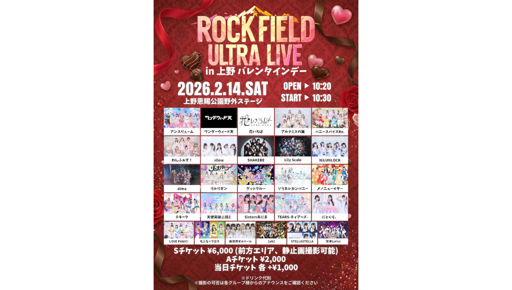 2月14日に『rock field ULTRA LIVE in 上野バレンタインデー』2月15日に『rock field ULTRA LIVE in 上野バレンタインデー+1』開催決定